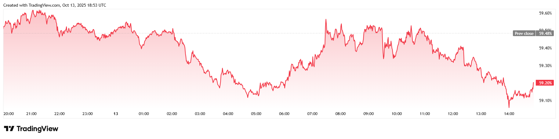 Двадцатичетырёхчасовой торговый прилив снизился на 7,95% до 82,13 миллиарда долларов, игнорируя обычный понедельничный всплеск. Масштаб его империи увеличился на 1% до 2,29 триллиона долларов, отражая суточный рост. Но гегемония Bitcoin уменьшилась на 0,54% до 59,20% на момент публикации отчёта.