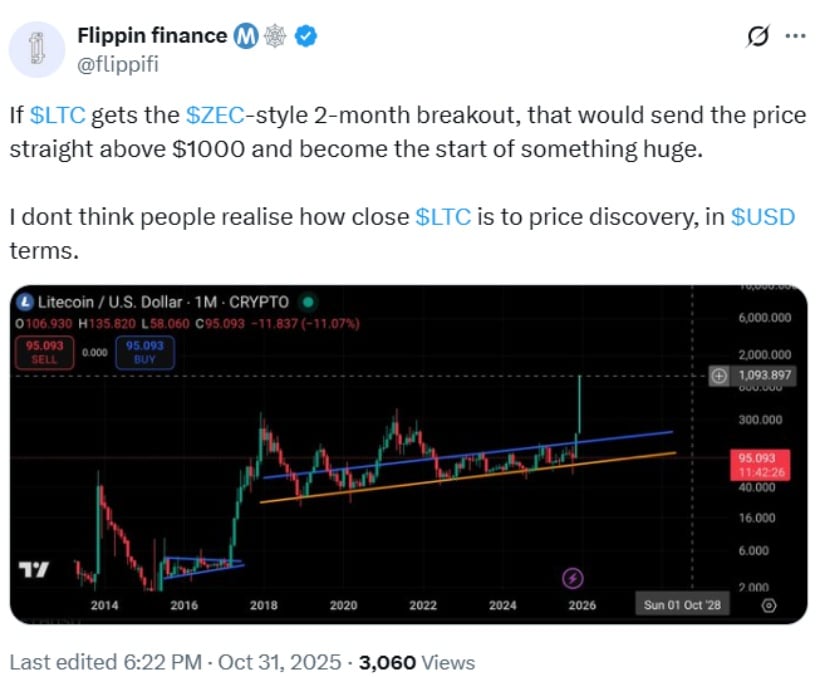 Некоторые аналитики, всегда ищущие закономерности, как ребёнок с лупой, проводят параллели между Litecoin и знаменитым 10-кратным скачком Zcash в конце 2025 года – с $39 до более чем $370. Может ли LTC готовиться к аналогичному прорыву? Наблюдатели говорят, что тренд Litecoin с 2014 года отражает поведение, наблюдаемое в других альткоинах перед прорывом. Итак, если всё идеально совпадёт (и звёзды будут в хорошем настроении), мы можем увидеть огромный скачок цены. @flippifi, бесстыдный промоутер LTC, заявил: «Litecoin может стать следующей большой вещью!». Возможно, им стоит баллотироваться в политику. 🇱🇷